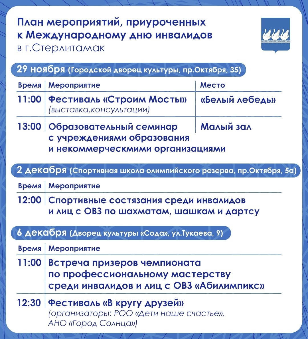 г. Стерлитамак будет проведён инклюзивный фестиваль «Строим мосты», приуроченный к Международному дню инвалидов в г. Стерлитамак. (План мероприятий прилагается).